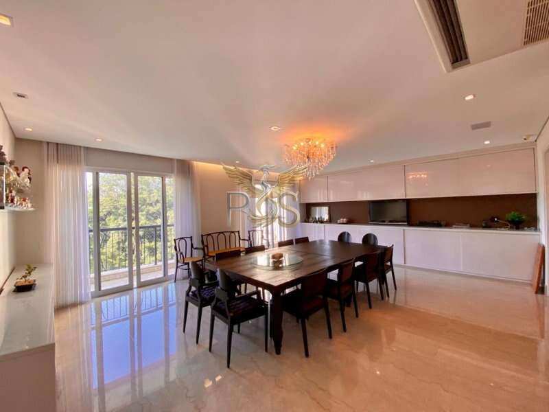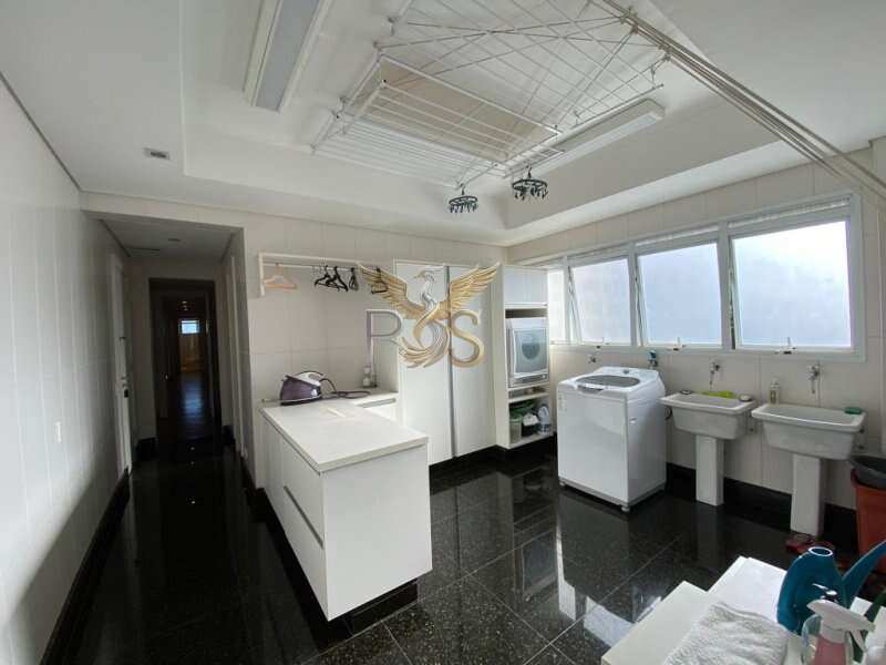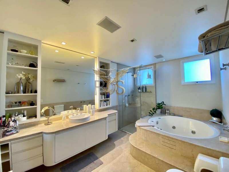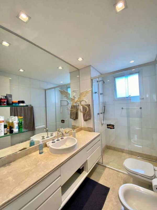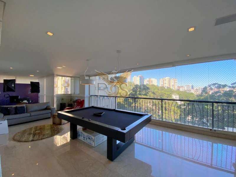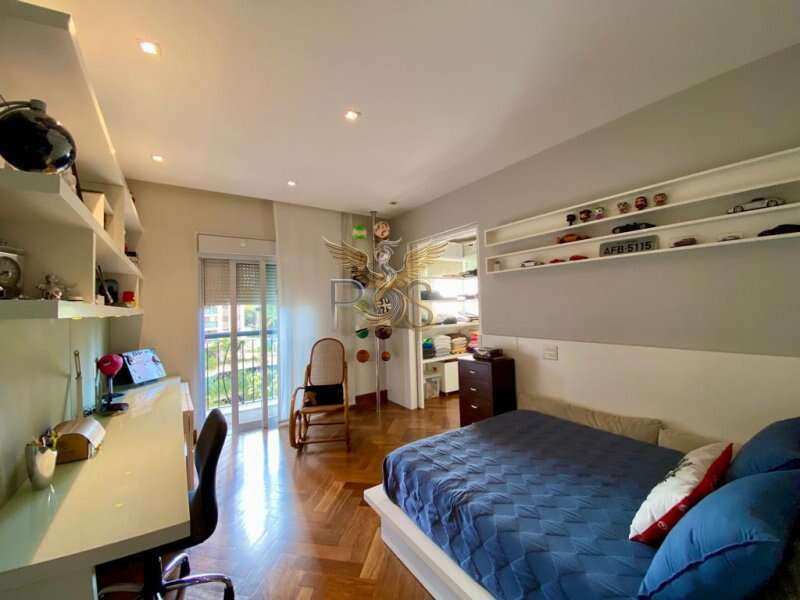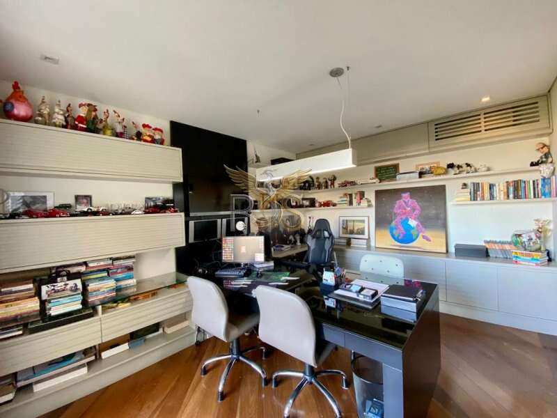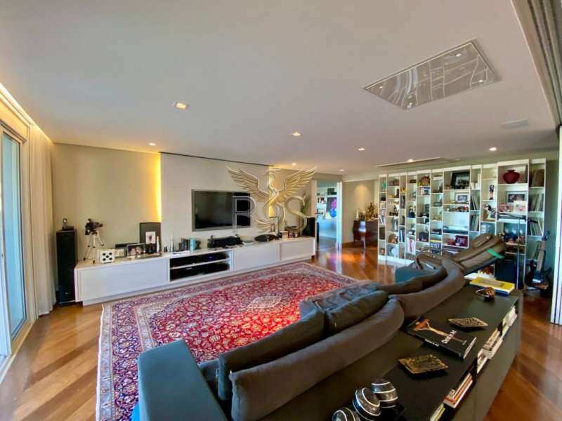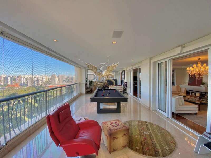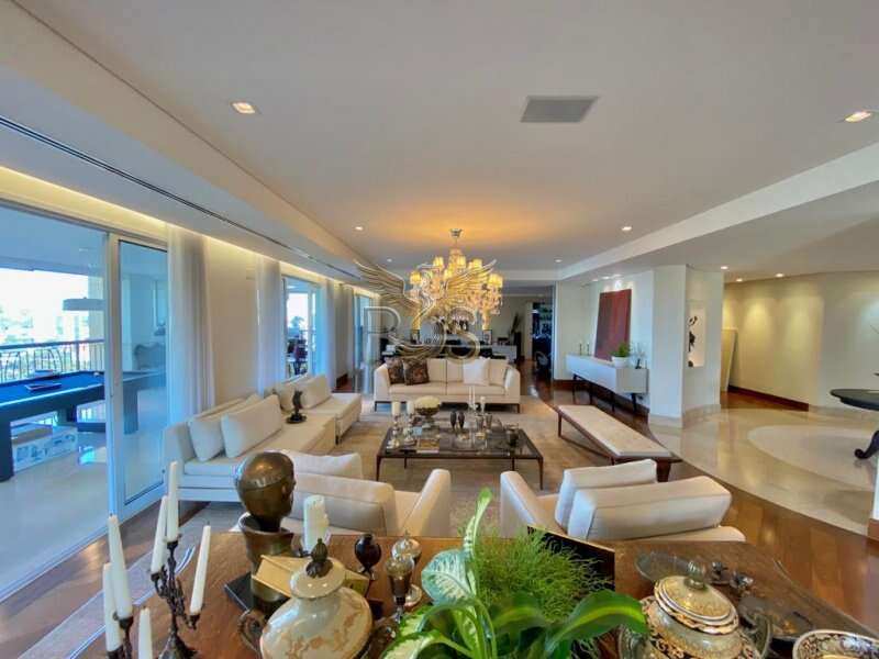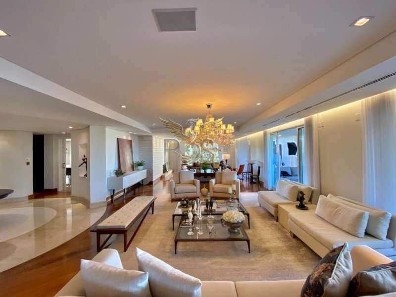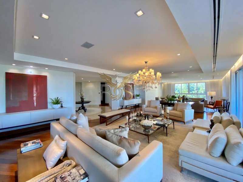 São 607m², hall social com 2 elevadores, 4 suítes ( sendo a suíte master com closet e banheiro Sr. e Sra. ), amplo living pra 3 ambientes, escritório, sala ampla de jantar, lavabo, área de serviço com dormitório e banheiro de empregada, cozinha ampla com ilha e despensa e uma varanda enorme com uma vista sensacional para o Parque Burle Marx.
