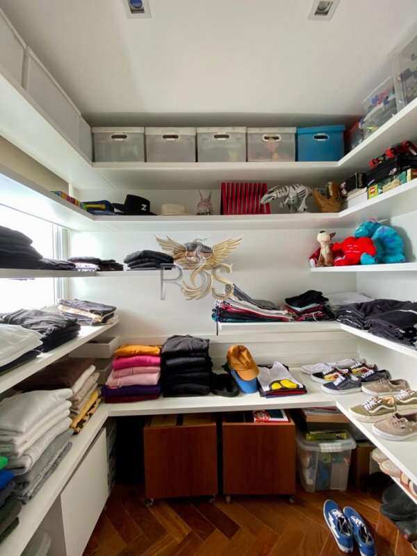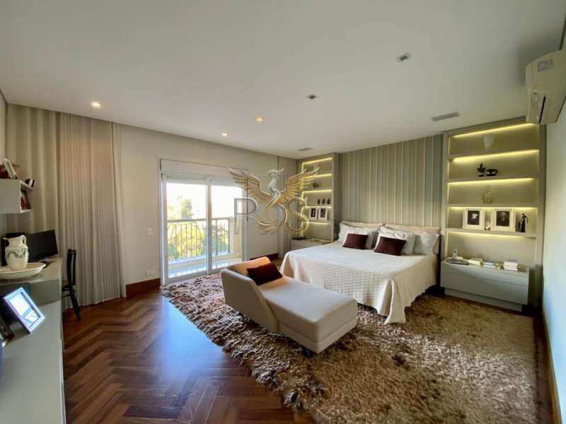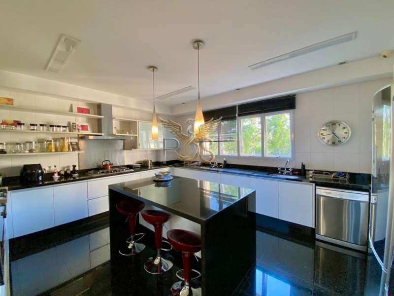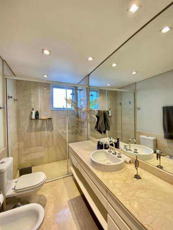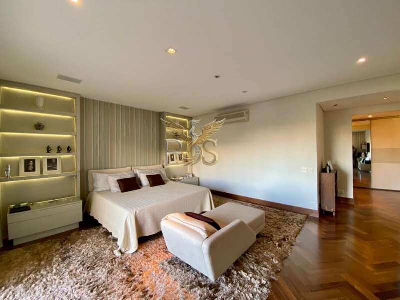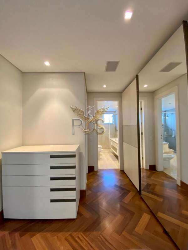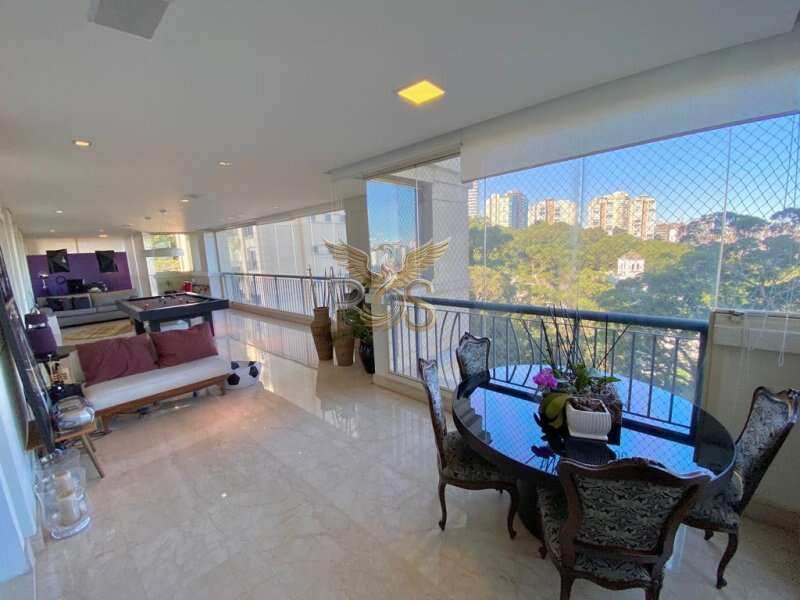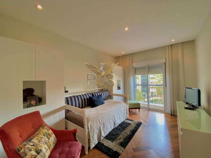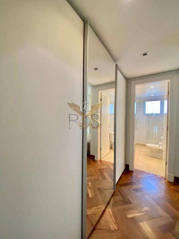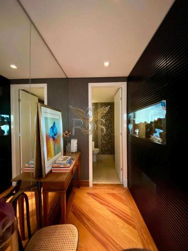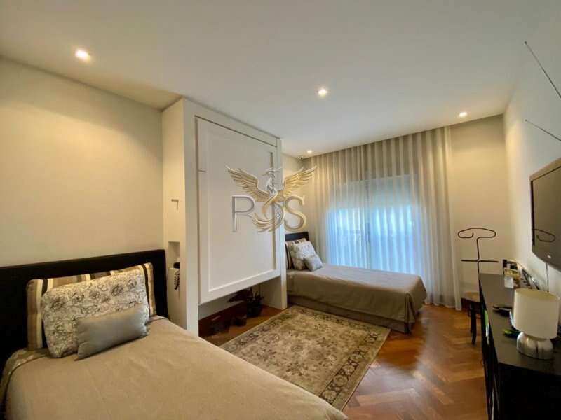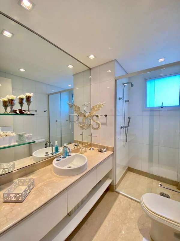 São 607m², hall social com 2 elevadores, 4 suítes ( sendo a suíte master com closet e banheiro Sr. e Sra. ), amplo living pra 3 ambientes, escritório, sala ampla de jantar, lavabo, área de serviço com dormitório e banheiro de empregada, cozinha ampla com ilha e despensa e uma varanda enorme com uma vista sensacional para o Parque Burle Marx.