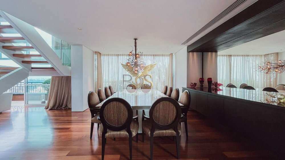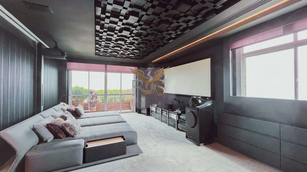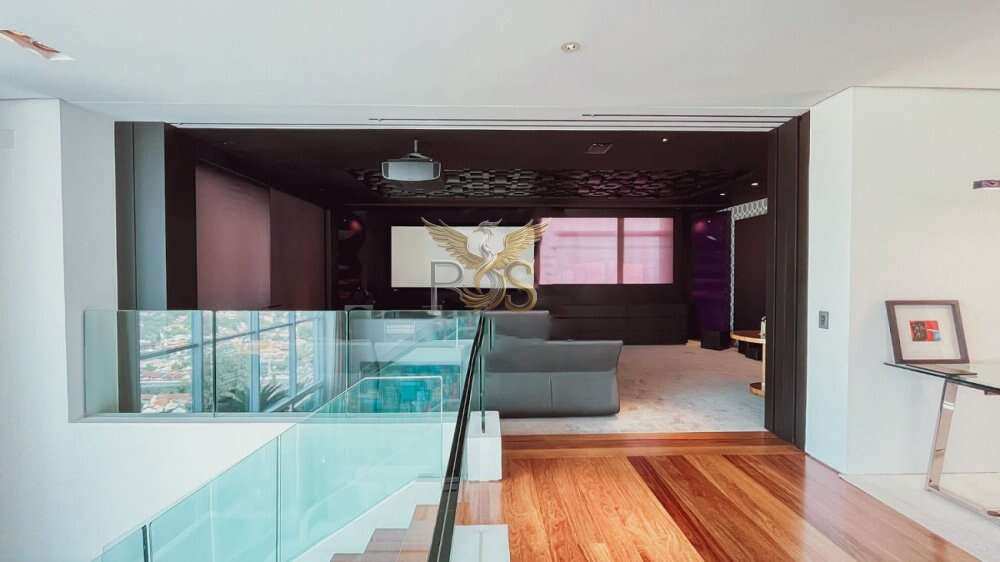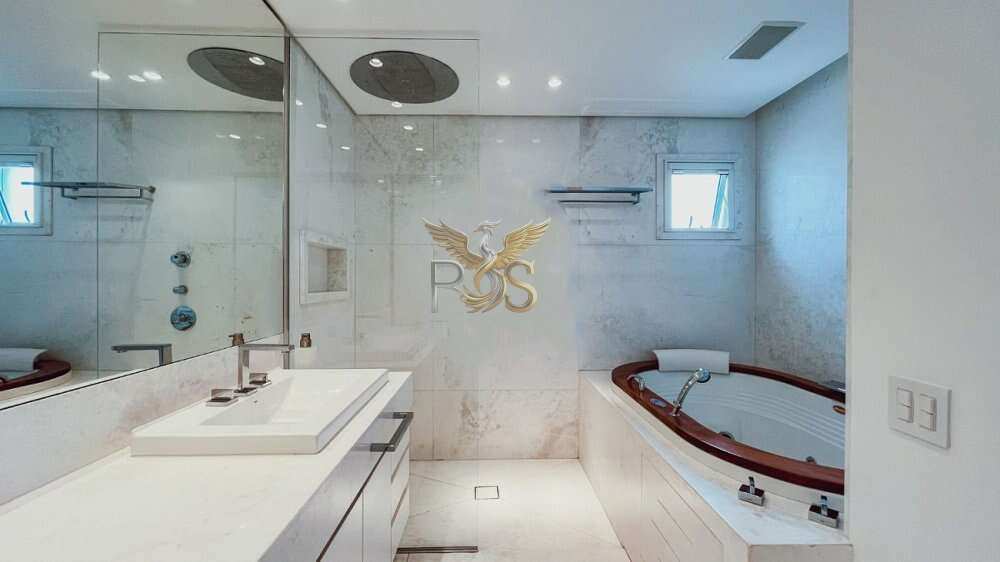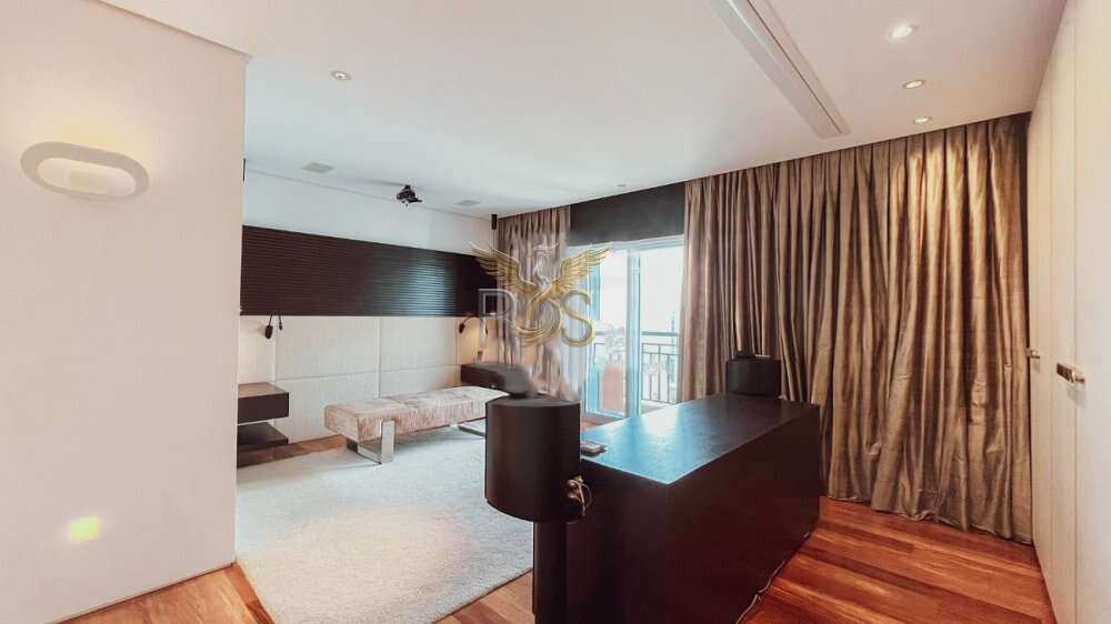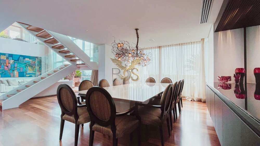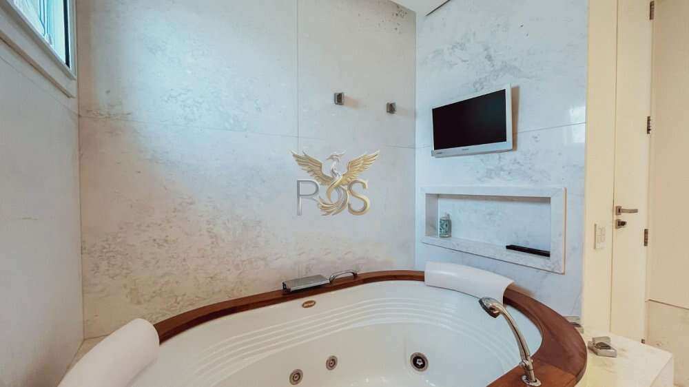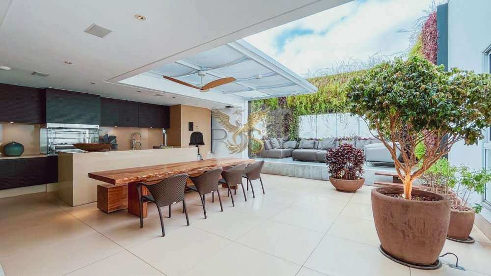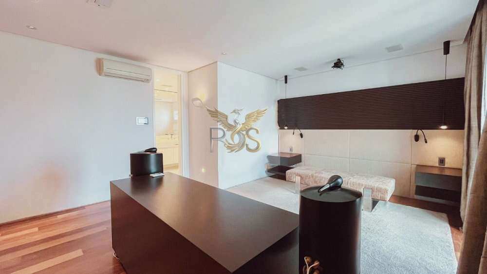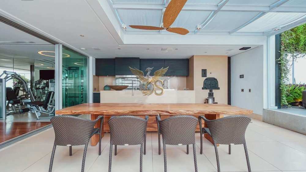 O imóvel tem 4 quartos, sendo 4 suítes, possui 5 banheiros, 4 salas e 6 vagas de garagem.